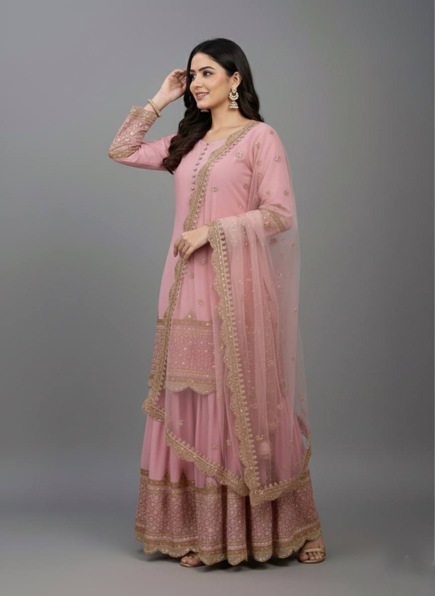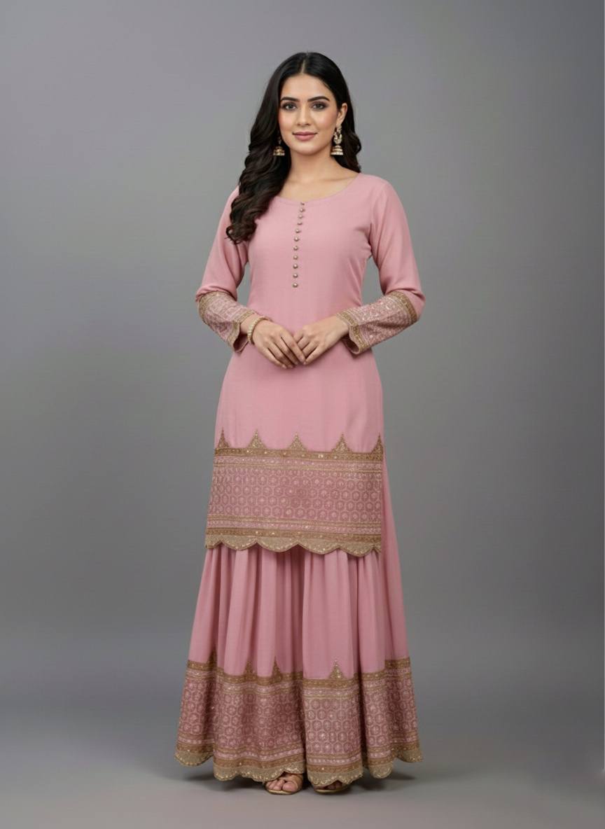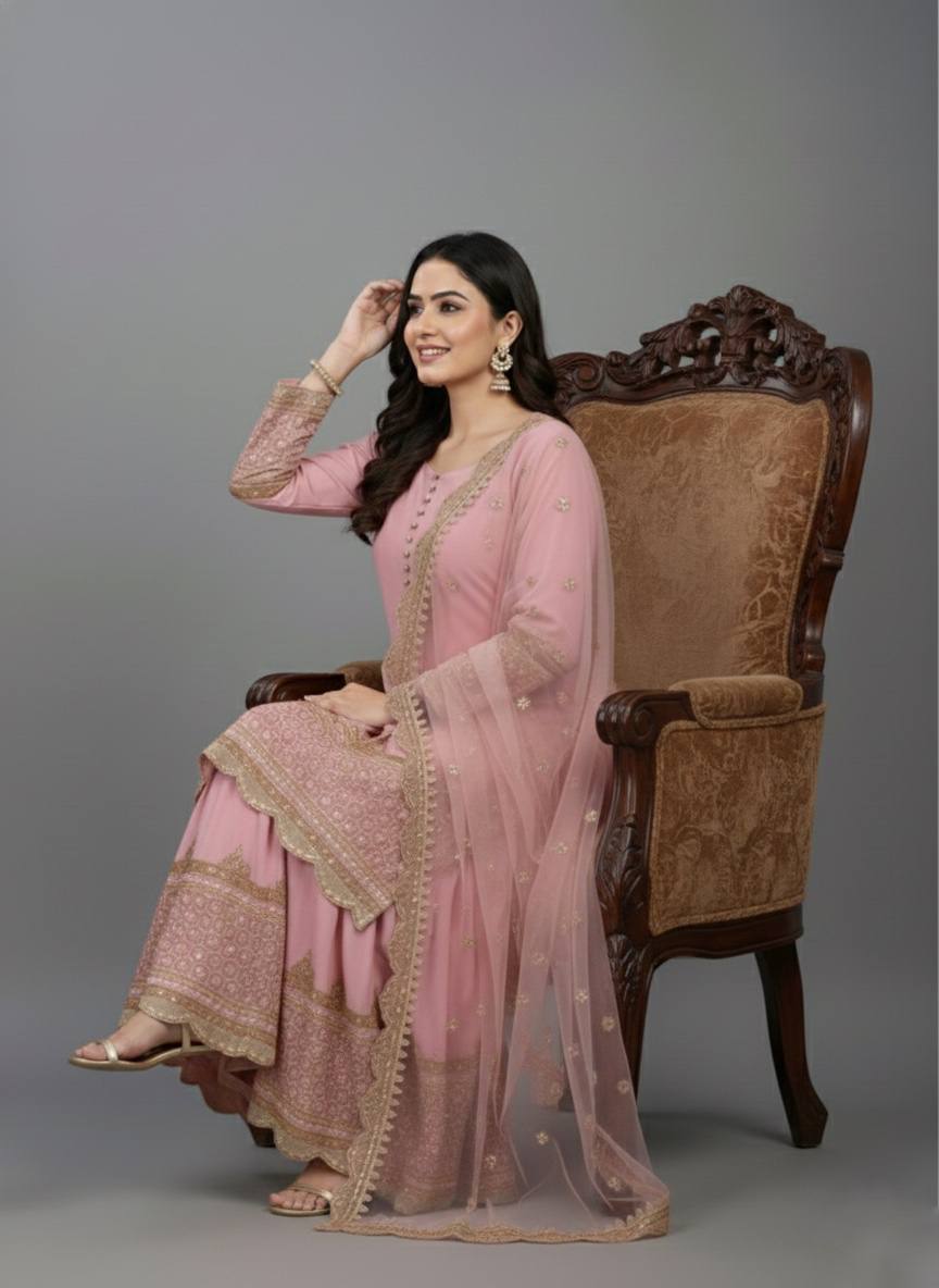 Step into graceful elegance with this blush pink kurti sharara set, beautifully adorned with delicate golden embroidery and a soft sheer dupatta π Perfect for weddings, festive celebrations, and special occasions where you want to shine π