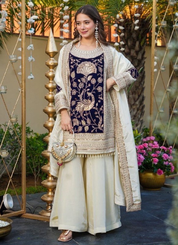 Step into timeless elegance with this navy blue kurta adorned in rich gold embroidery, paired with flowy ivory palazzos and a luxe dupatta ⨠Perfect for festive evenings, weddings, and celebrations where grace meets royalty šš«