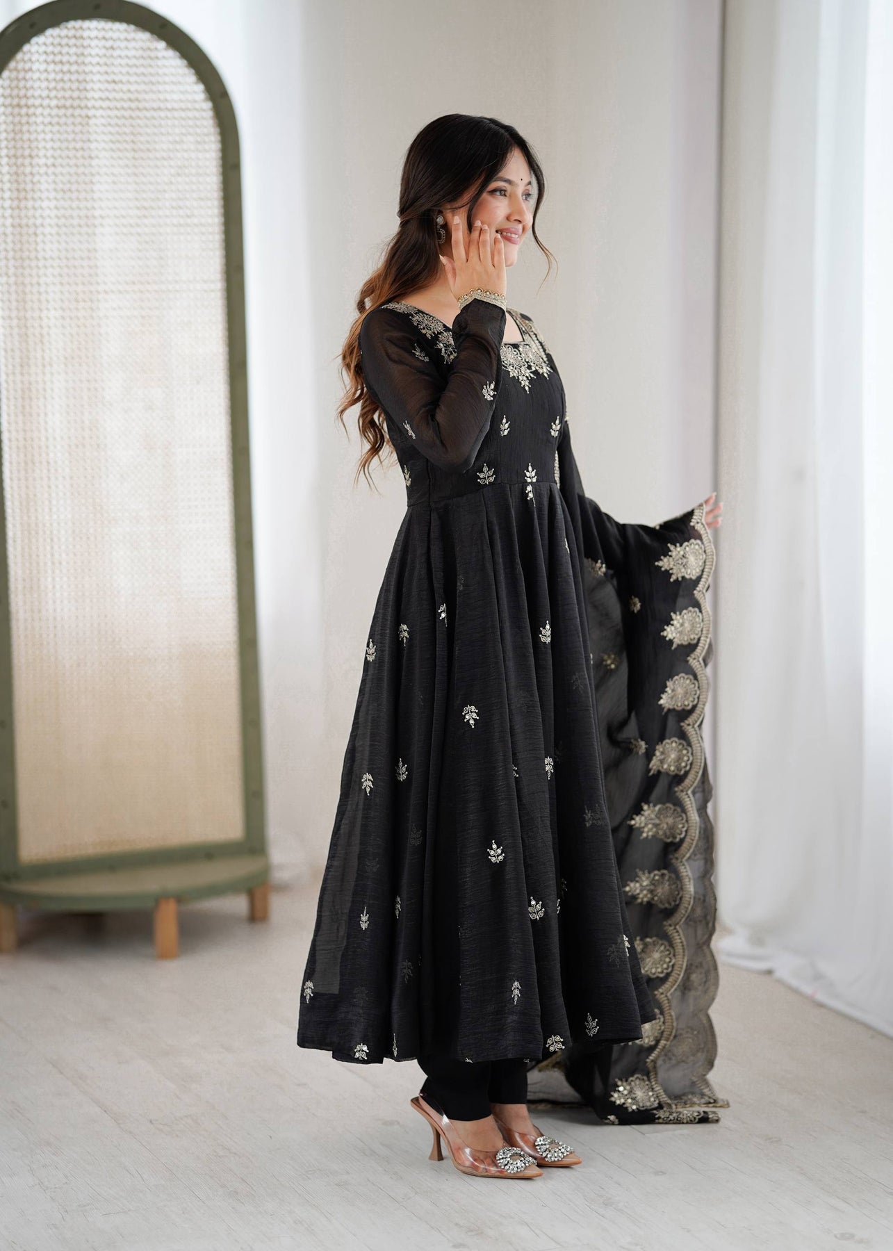 Stunning black Anarkali suit with elegant silver floral embroidery for a classy royal look πΈ