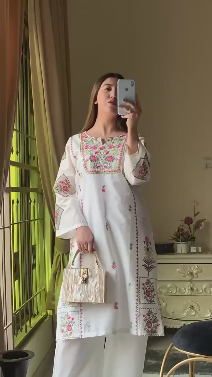 Embrace simplicity with sophistication in this beautiful white embroidered suit, adorned with delicate floral patterns in soft hues. πΈ