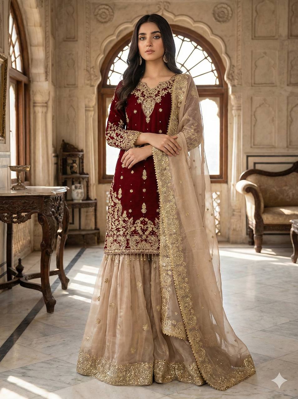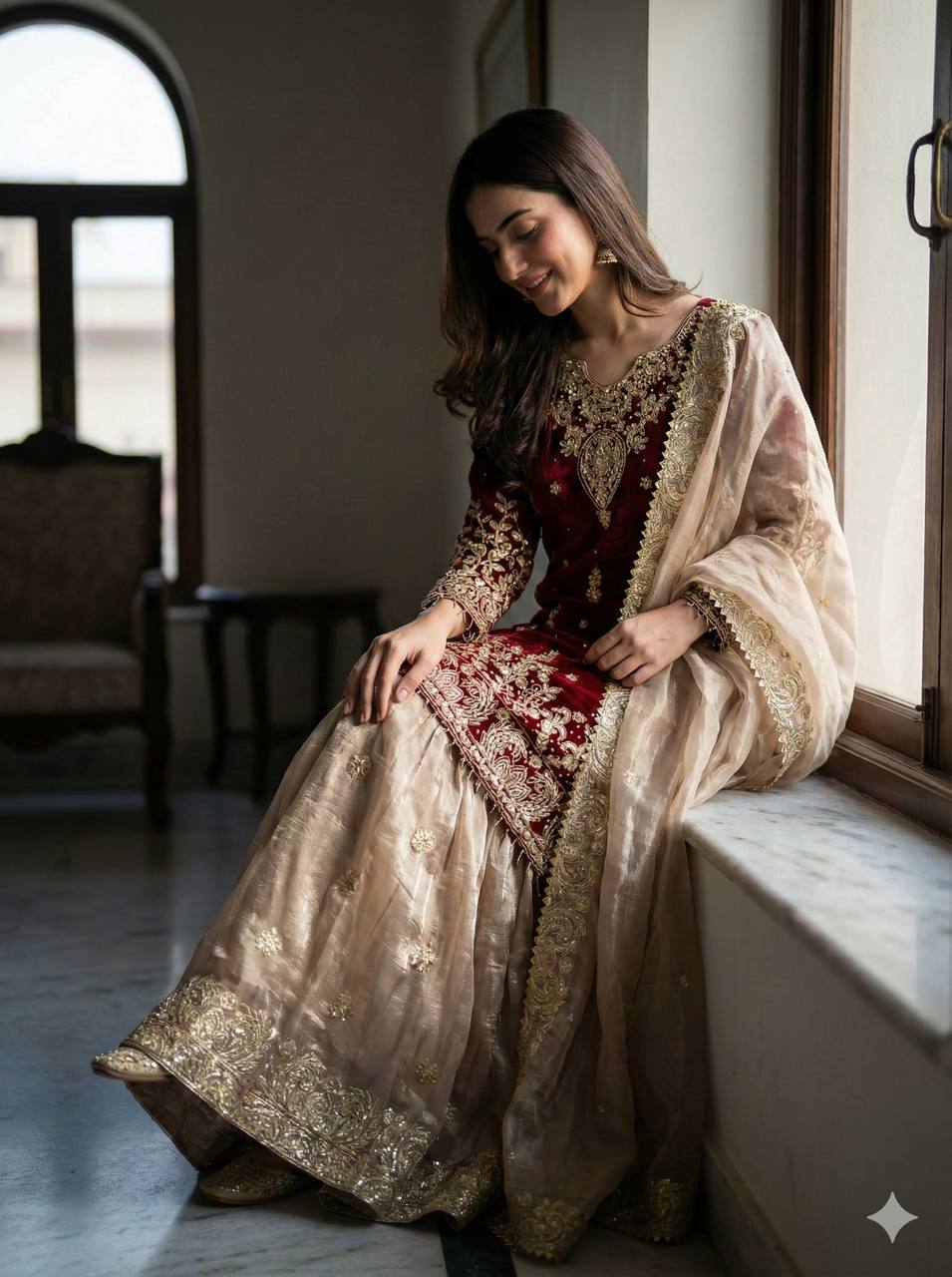 A deep maroon kurta highlighted with intricate gold embroidery, paired gracefully with a flowy gold-toned palazzo and a soft sheer dupatta 🌟👑 Perfect for weddings, festive occasions, and special celebrations where classic charm meets luxury ✨