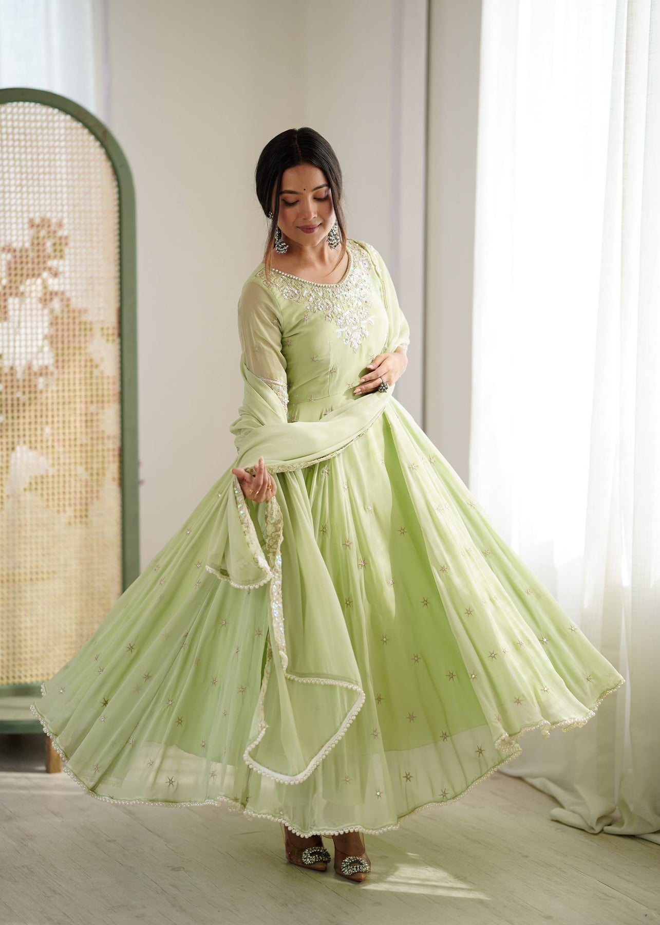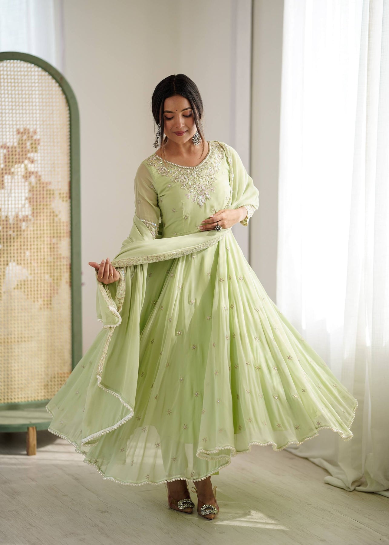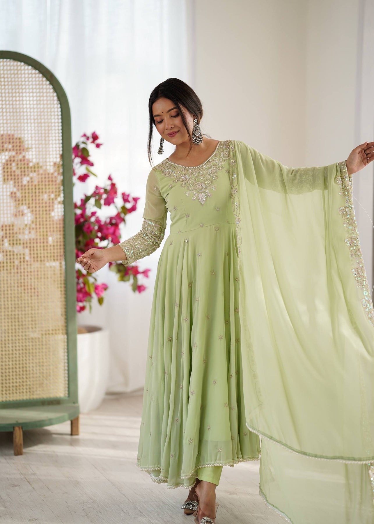 Soft mint green anarkali with delicate floral embroidery and a flowy sharara for an ethereal festive look 💚