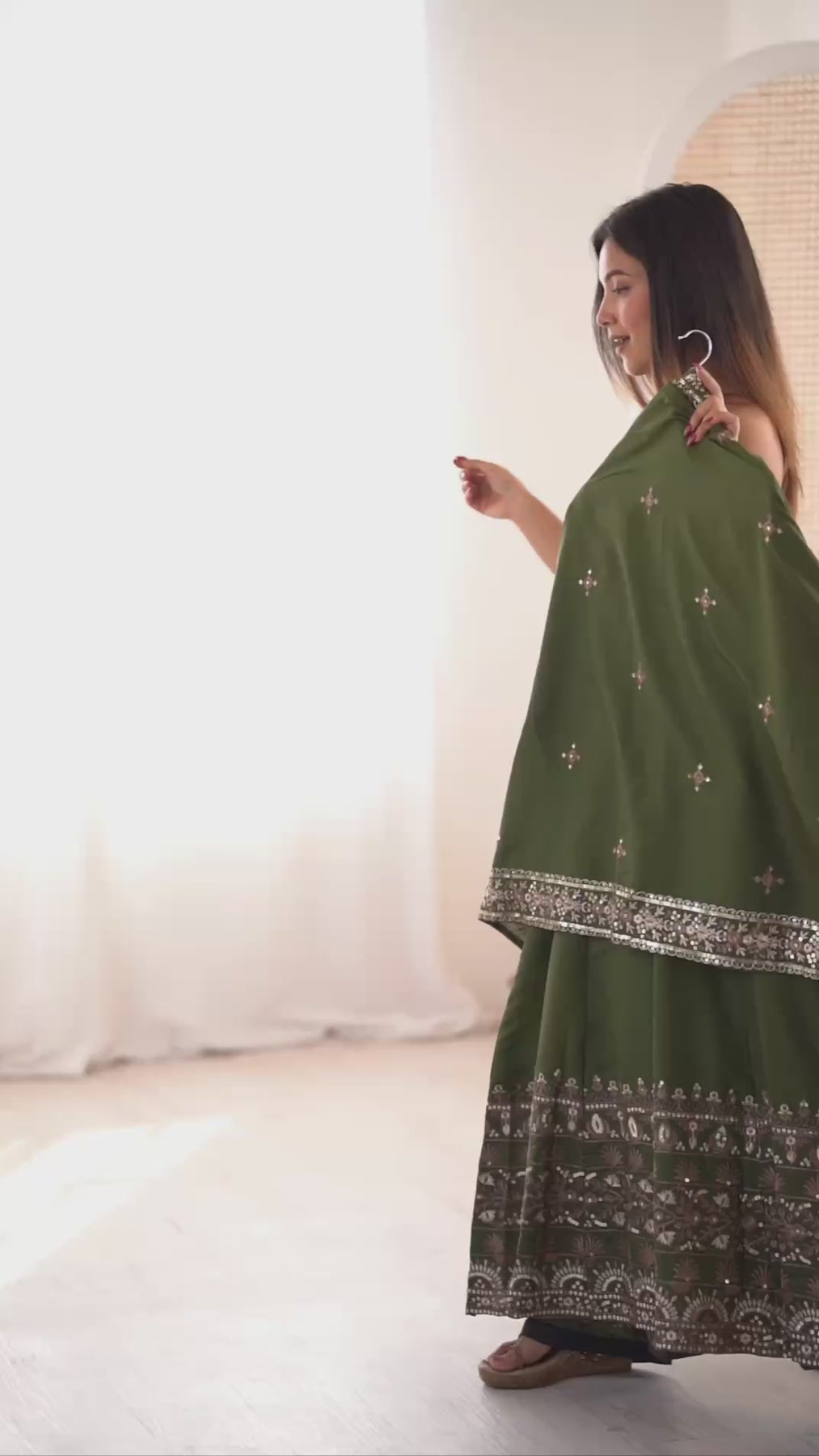 Beautiful olive green Anarkali suit with intricate floral embroidery for a royal festive look 🌸