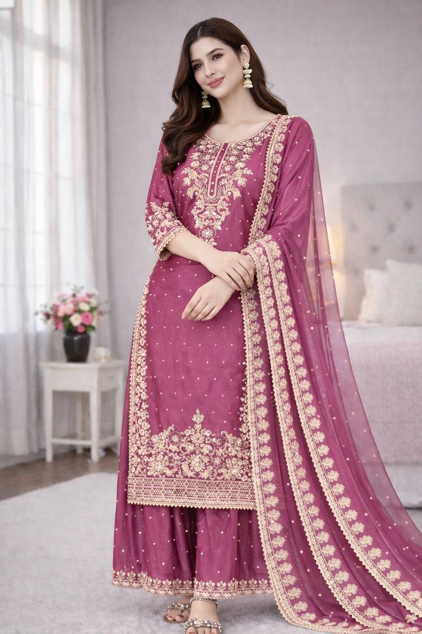 Elegant rose pink kurti sharara set adorned with intricate golden floral embroidery for a festive and royal look π